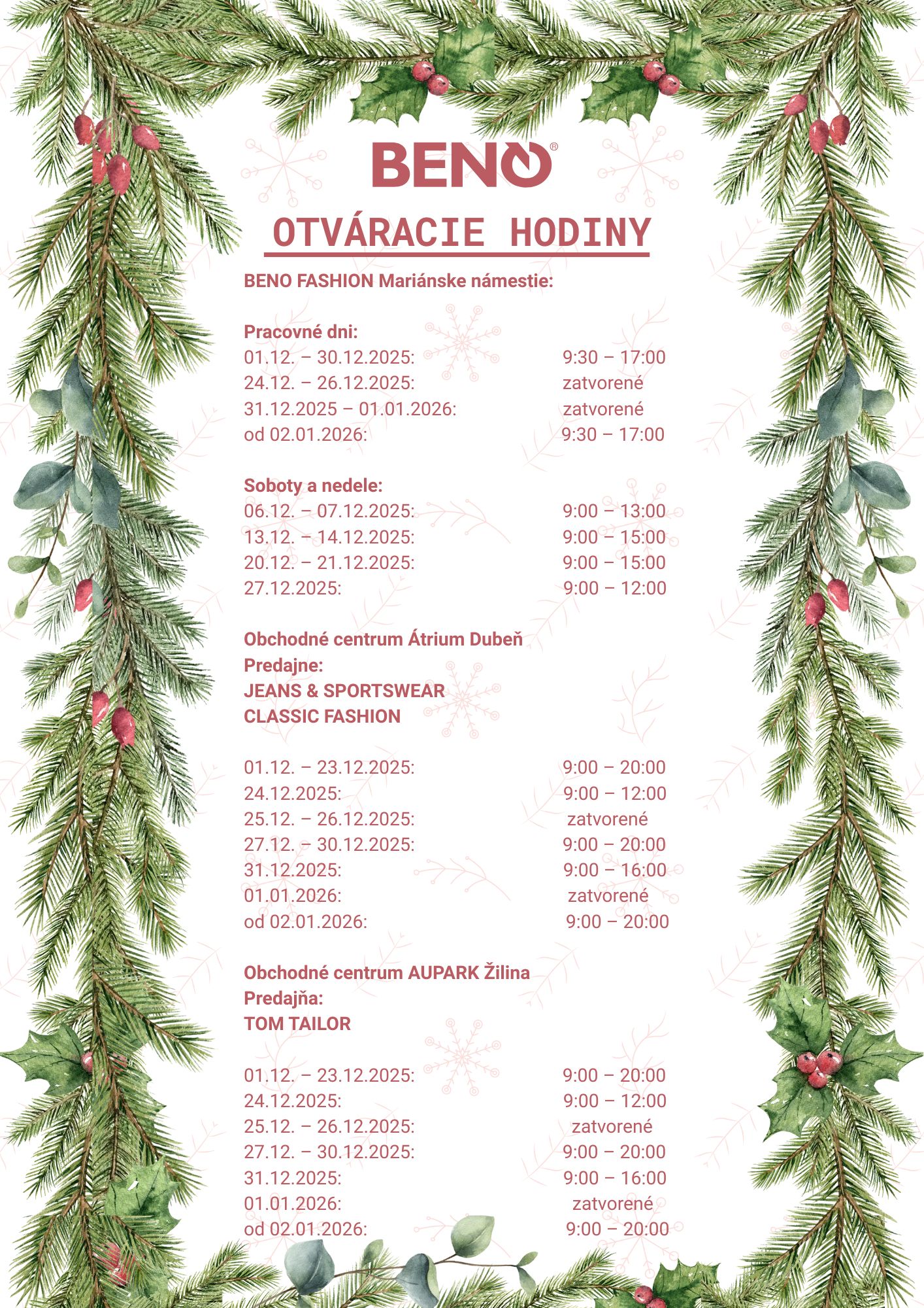Počas vianočného obdobia upravujeme otváracie časy našich predajní, aby ste si mohli pohodlne vybaviť všetky nákupy ešte pred sviatkami. Naše predajne v centre mesta aj v obchodných centrách budú mať predĺžené alebo upravené hodiny, pričom počas sviatočných dní budú niektoré predajne zatvorené.