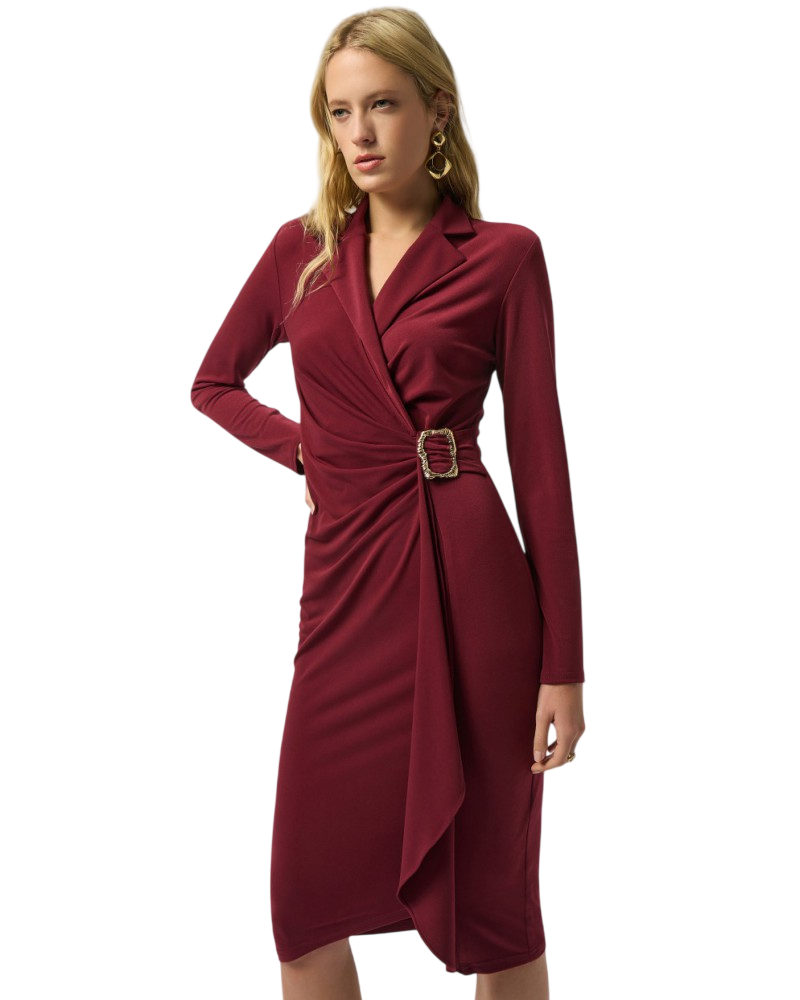 Vínová klasika s prvkami saka: Pre milovníčky čistých línií sú tu šaty vo farbe bordó. Golier pripomínajúci klopy saka a výrazná zlatá pracka vytvárajú look, ktorý je prísny a zvodný zároveň.
